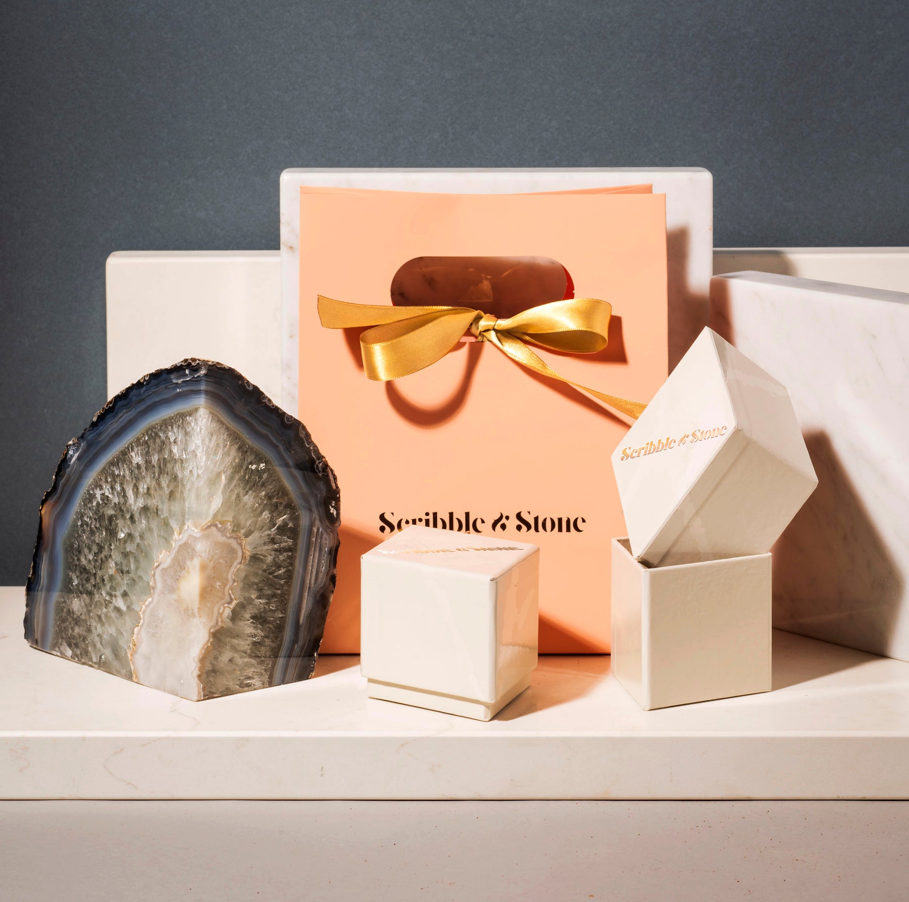 All of our pieces come in a beautiful Scribble & Stone jewellery box with gold metal embellishment. Made from FSC certified sustainably sourced paper these are designed to be long life and kept for many years to come.