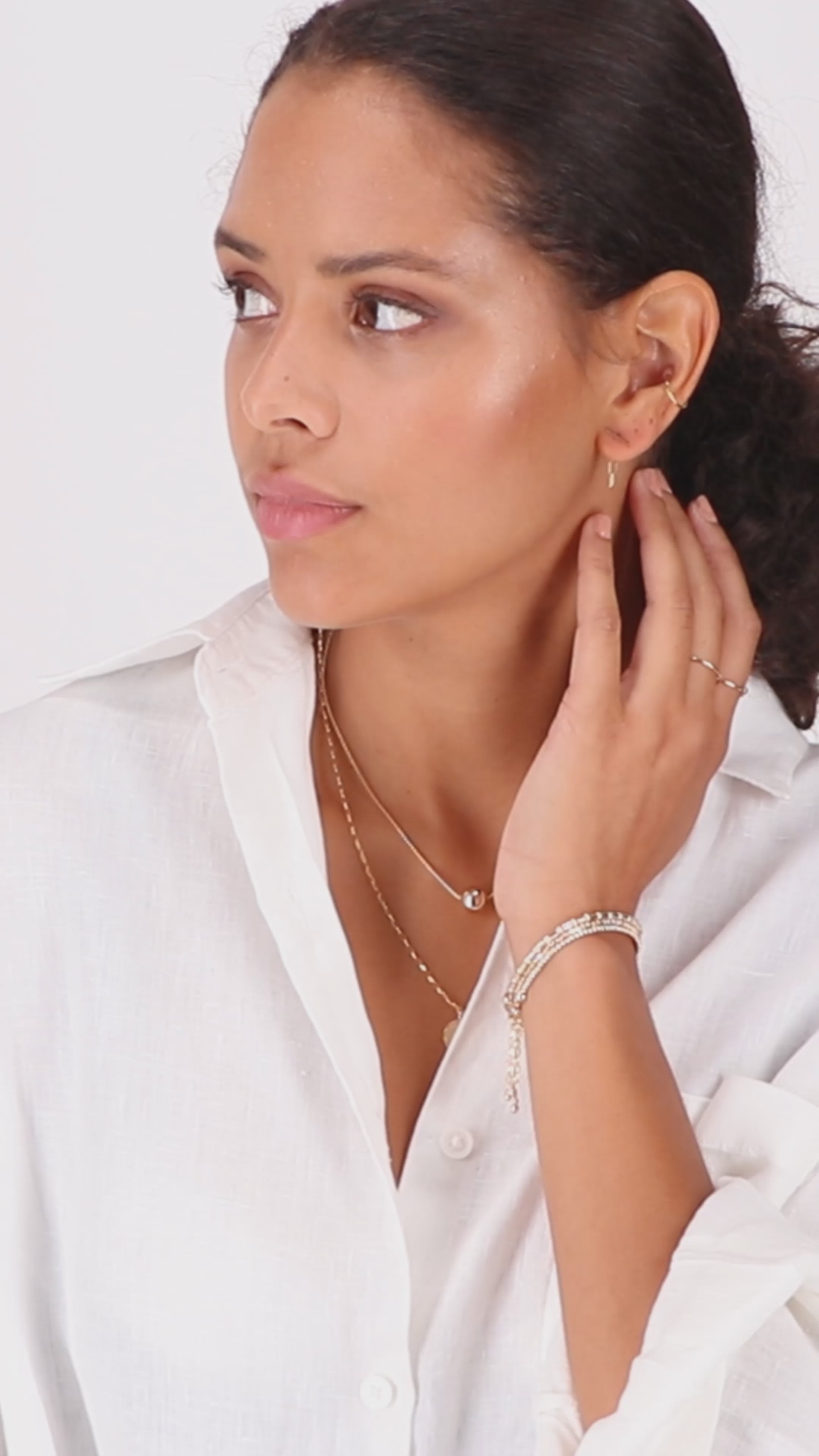 Our packaging, designed by an award-winning design studio with sustainability in mind, uses FSC®-certified paper and long-life materials. The jewellery is placed in an eco-friendly cotton pouch then placed inside our signature long-life jwellery box and presented in a pink FSC-certified gift bag with ribbon handles — ready for gifting.